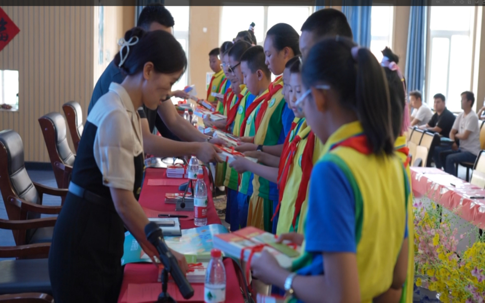 (摄影者:歹淑丽)图为发放仪式上,为各学校优秀学生代表发放了由库车市新华书店捐赠的“绿书签”、优秀读物