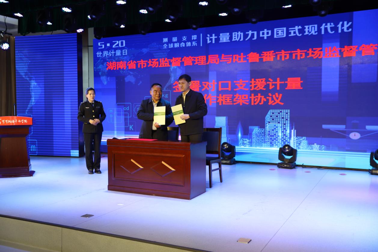 湖南省市场监督管理局与新疆维吾尔自治区吐鲁番市市场监督管理局签署对口支援计量合作框架协议。