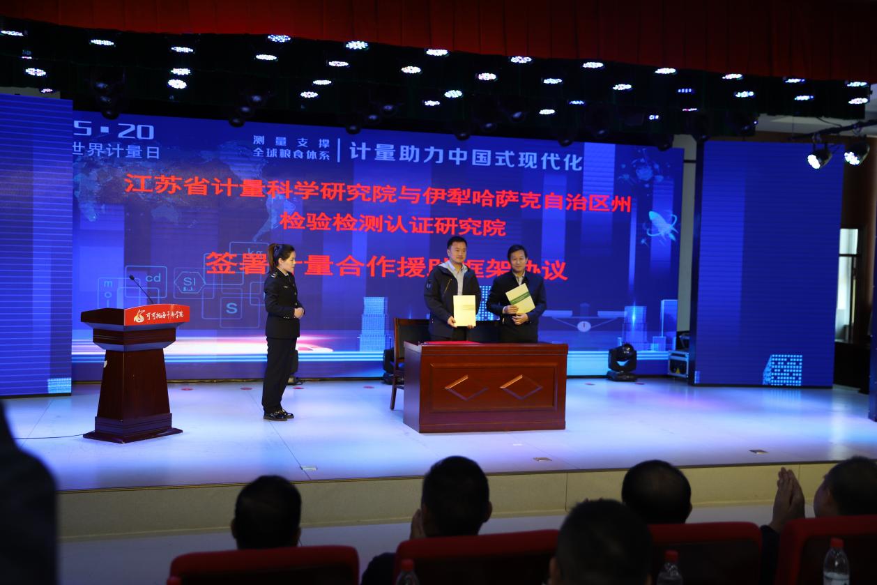 江苏省计量科学研究院与新疆维吾尔自治区伊犁哈萨克自治州检验检测认证研究院签署计量合作援助框架协议。
