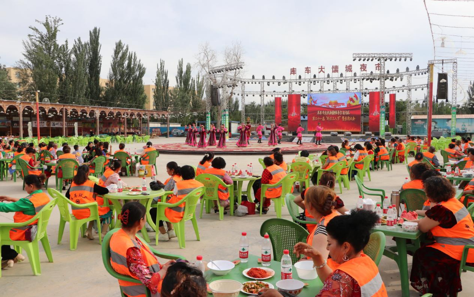 5月26日,新疆库车市举办自治区第二十一届环卫工人节庆祝活动,全市300多名环卫工人欢聚大馕城夜市,接受爱心企业慰问捐赠,看歌舞品美食,感受温馨的节日氛围。