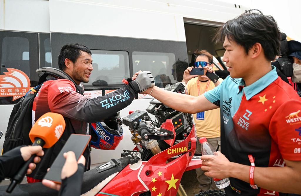 重庆凯越越野车队车手方明集(左)抵达终点后,与稍早完赛的儿子方响量握手庆祝(5月23日摄)。新华社记者 胡虎虎 摄
