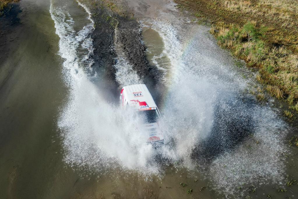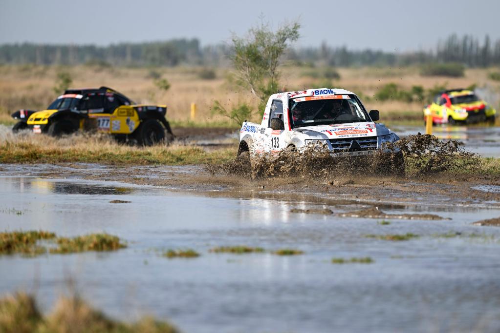 5月29日,黑龙江龍嘉先越拉力艺车队车手朱晖、领航员刘海林驾驶赛车冲过涉水路段。新华社记者 胡虎虎 摄