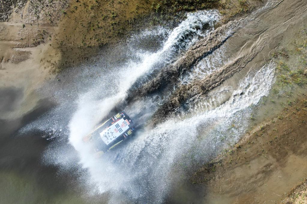 5月29日,明源实业CR6赛车队车手王明磊、领航员刘吉峰驾驶赛车穿过一处涉水路段(无人机照片)。新华社记者 郝昭 摄