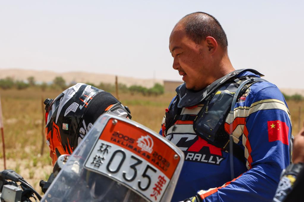 5月29日,月风拉力车队车手董超越过终点后补水休息。新华社记者 郝昭 摄