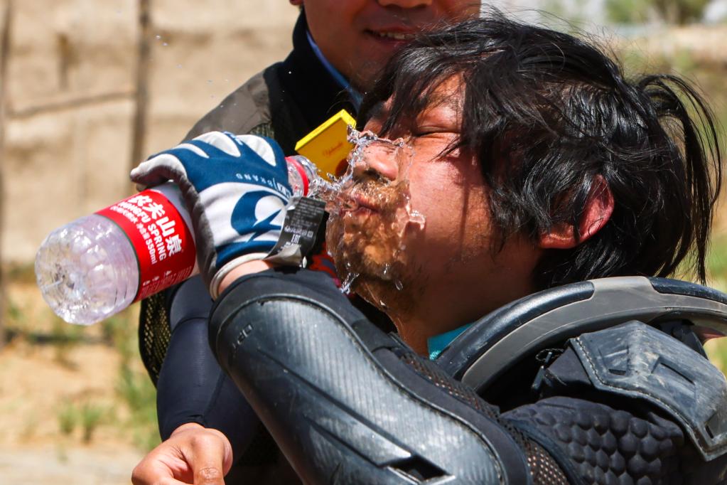 5月29日,陕西云翔汽摩运动有限公司车队车手訾云亮越过终点后补水休息。新华社记者 郝昭 摄