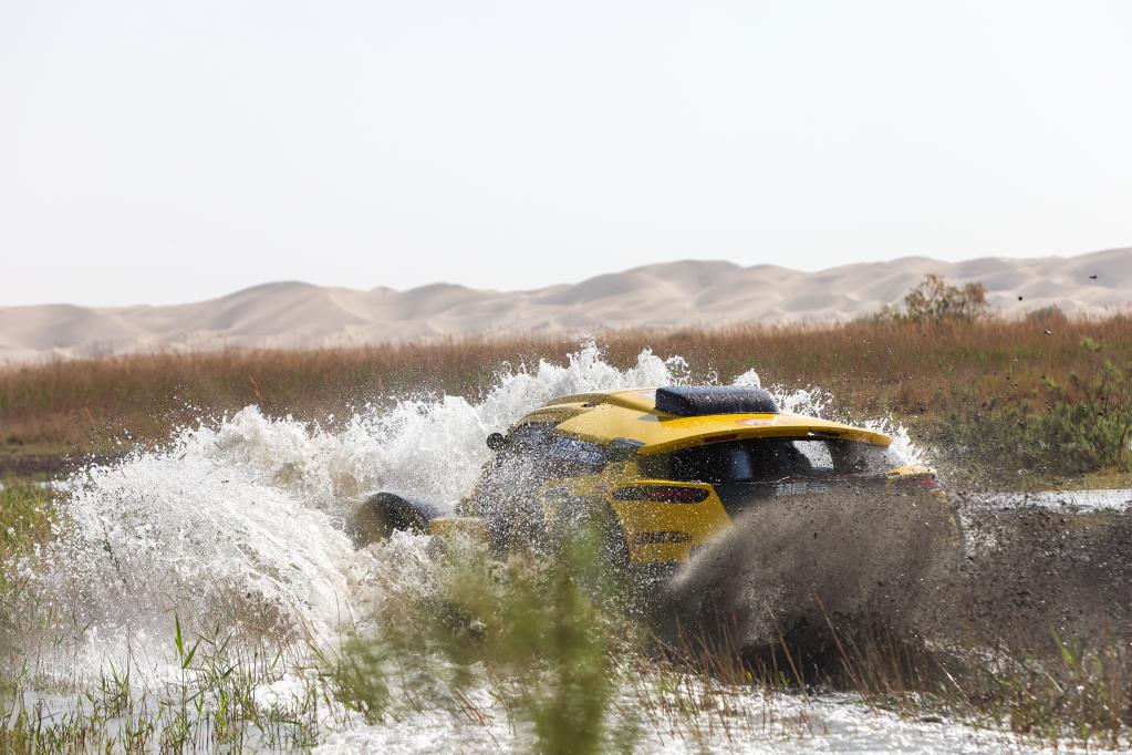 5月29日,广东硬虎赛车DO轮毂车队车手潘静波、领航员冯从彪驾驶赛车穿过涉水路段后,向赛道远处的沙丘前进。新华社记者 胡虎虎 摄