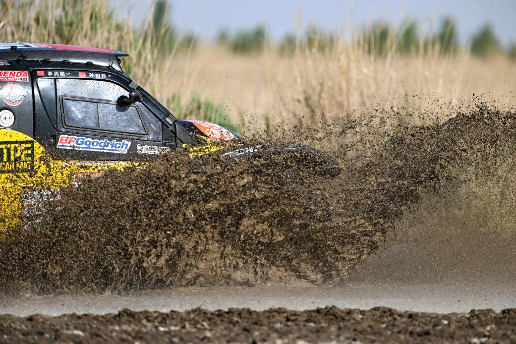5月29日,东胜拉力车队车手潘东、领航员高辉驾驶赛车驶过一处泥泞路段。新华社记者 胡虎虎 摄