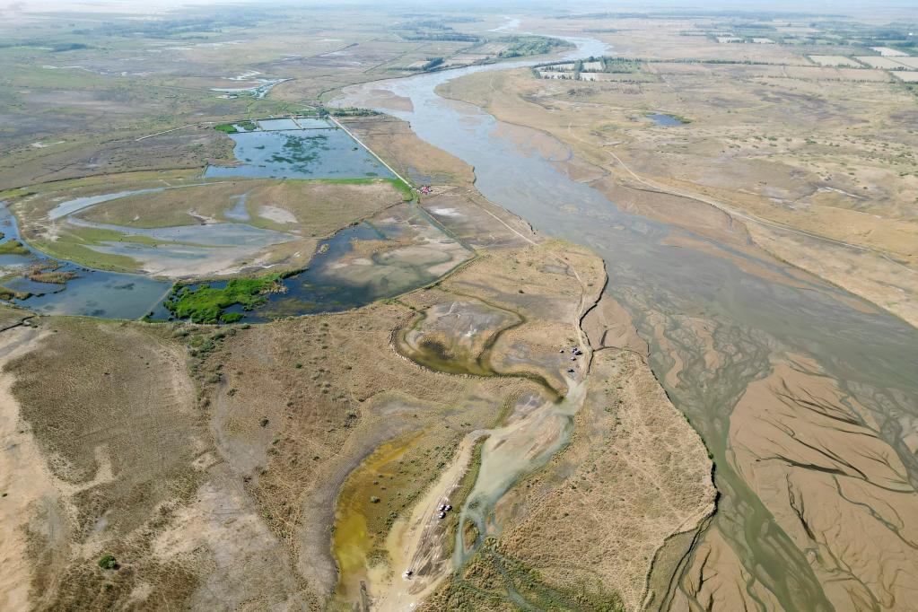5月29日,明源实业CR6赛车队车手王世林、领航员田雷驾驶赛车疾驰在克里雅河畔的沙漠上(无人机照片)。新华社记者 胡虎虎 摄