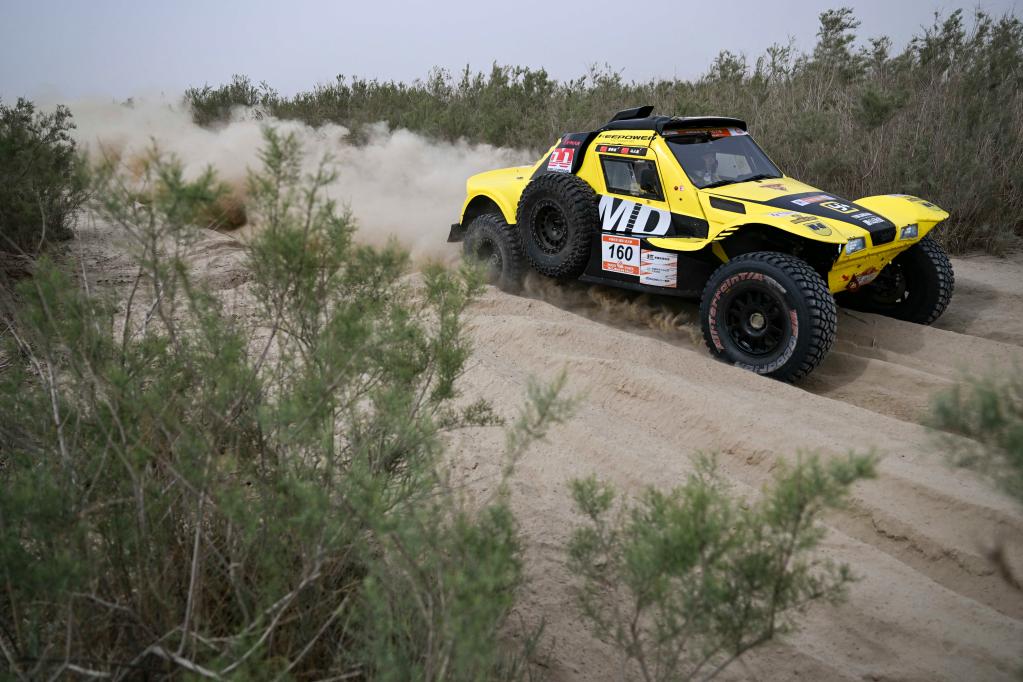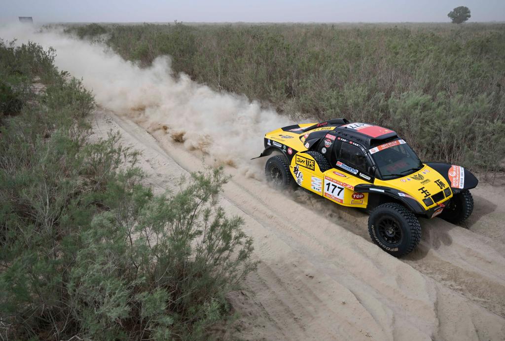 5月30日,八一钢铁车队车手林杰、领航员连俊杰驾驶赛车在比赛中。新华社记者 胡虎虎 摄