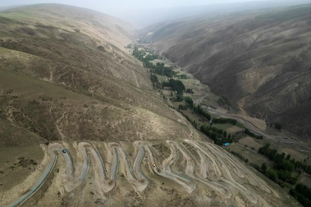 5月31日,赛车疾驰在盘山公路上(无人机照片)。新华社记者 郝昭 摄