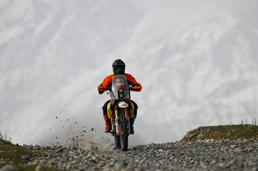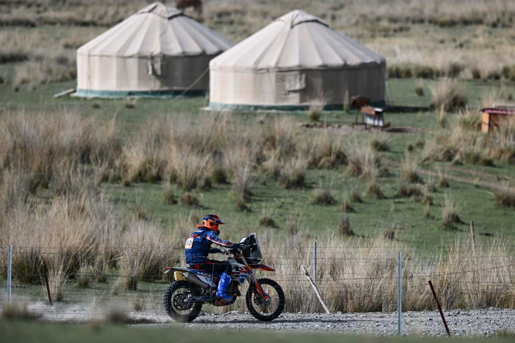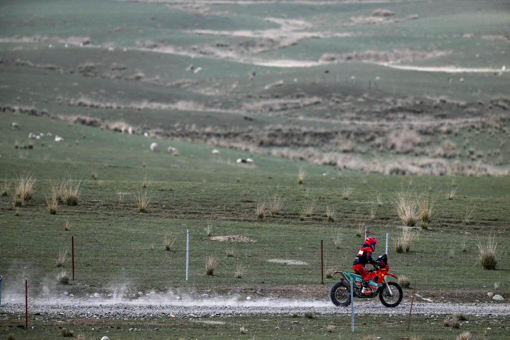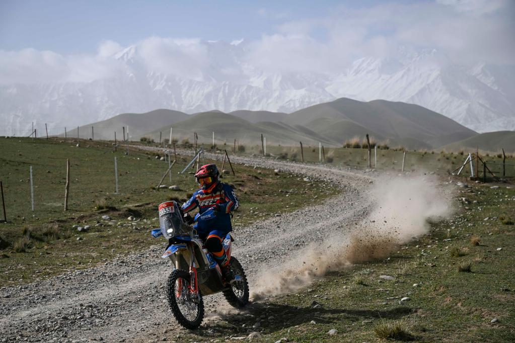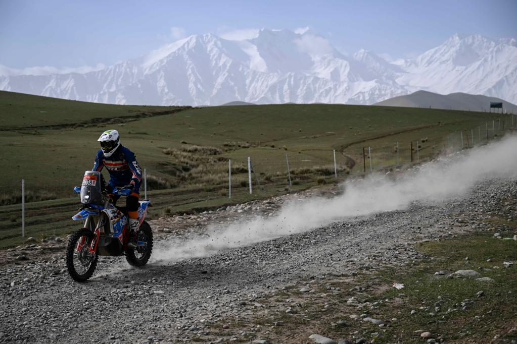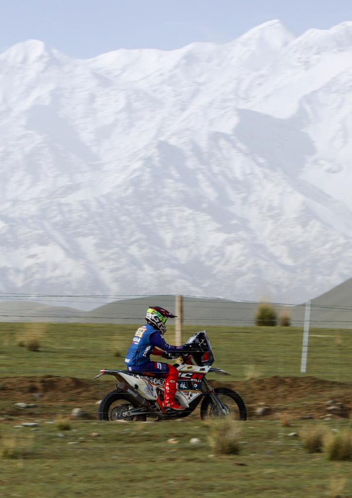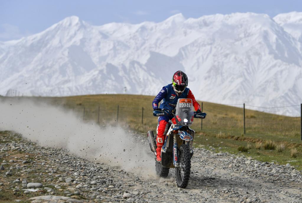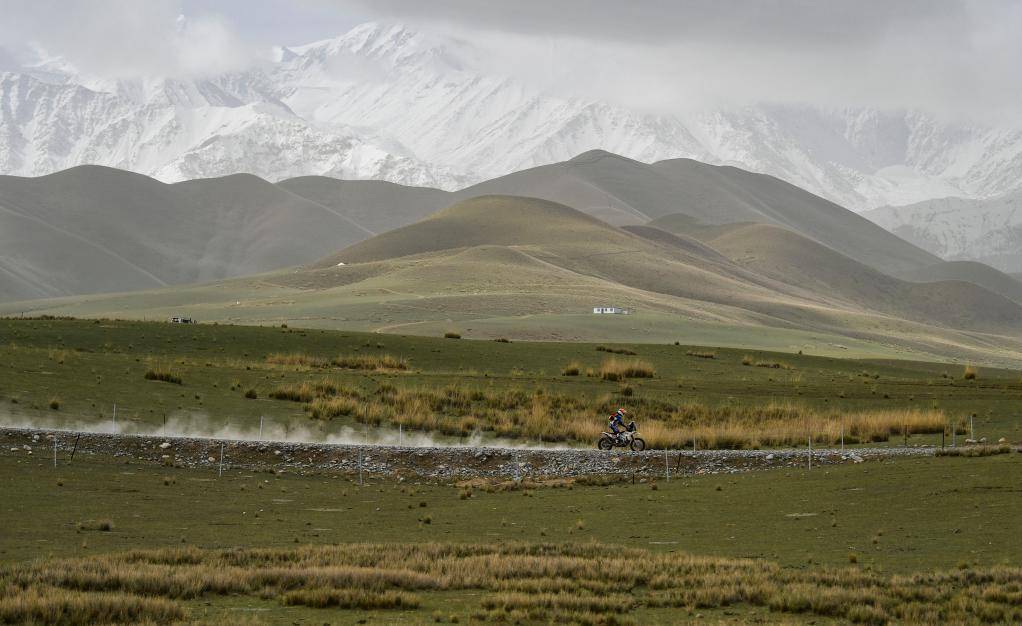 5月31日,陕西省榆林市红驼拉力赛车队1队南非车手科克斯驾驶摩托车疾驰在昆仑山脚下。新华社记者 郝昭 摄