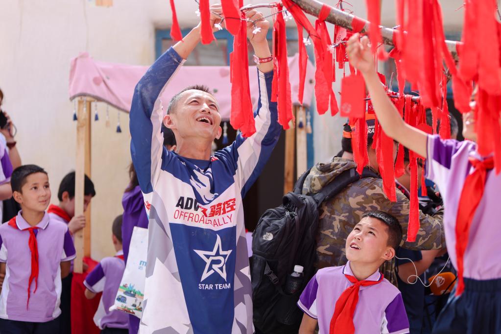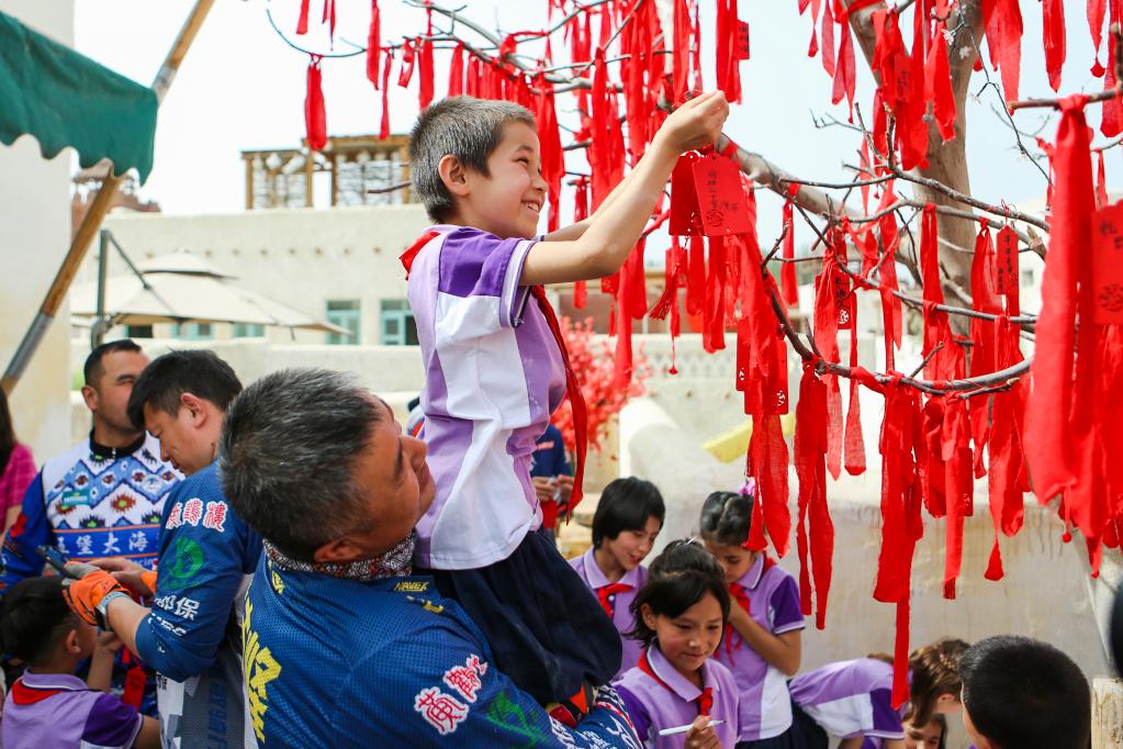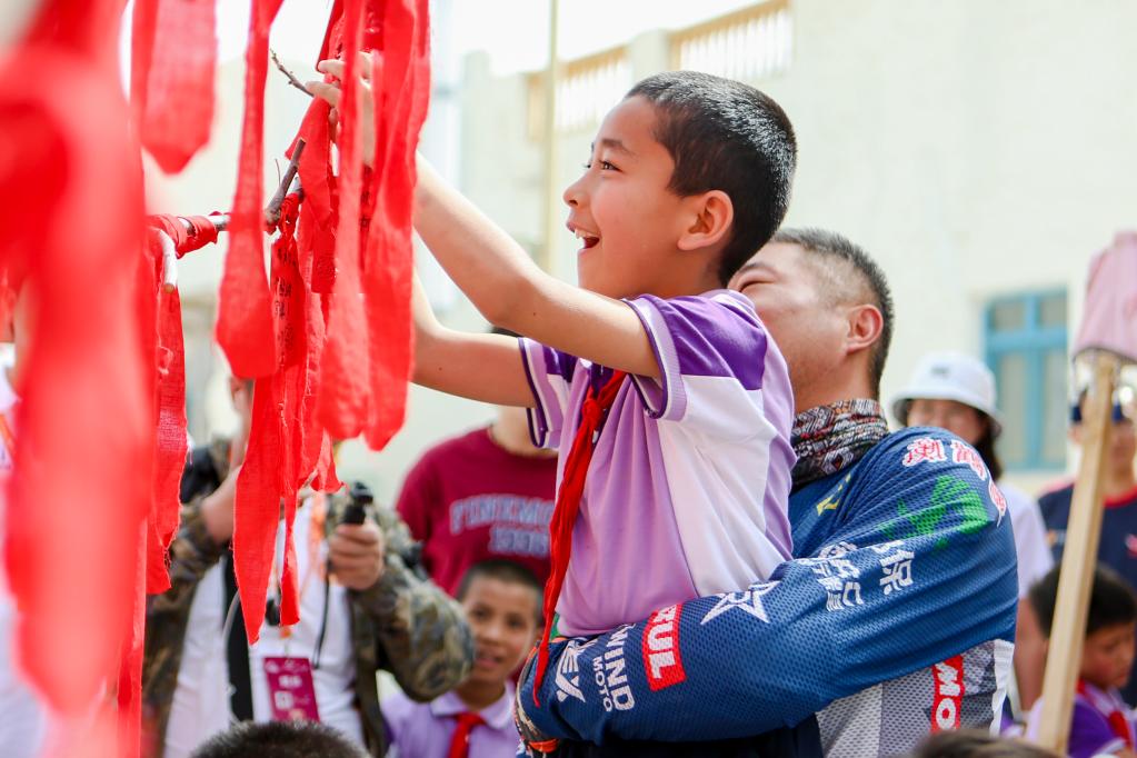 6月1日,星之队车手关克峰(右)在活动中与和田县巴格其镇第一中心小学学生一起挂上许愿牌。