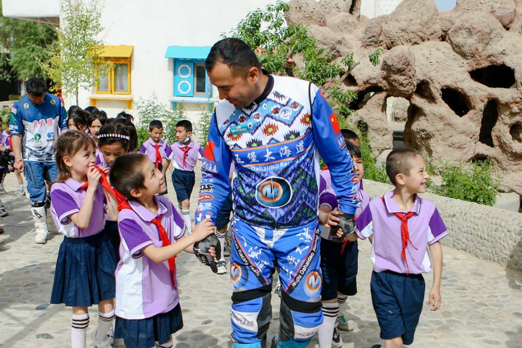 6月1日,新疆五堡大海道车队车手扎克尔·牙克甫(前中)与和田县巴格其镇第一中心小学学生在活动中交流。