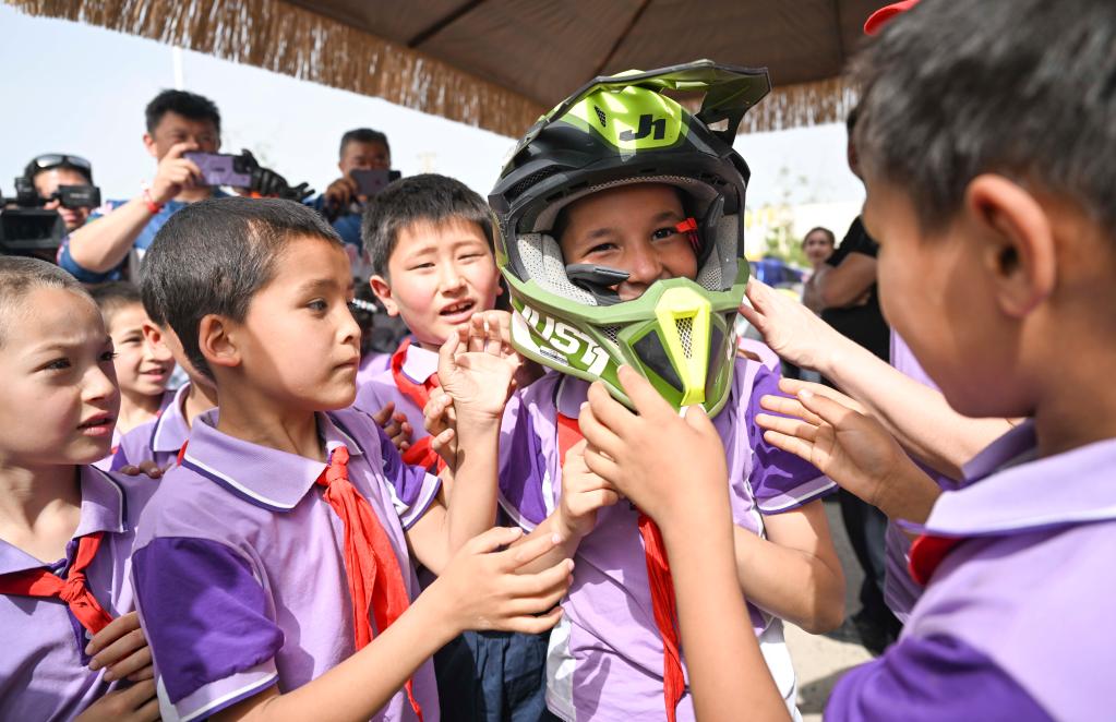 6月1日,新疆五堡大海道车队车手扎克尔·牙克甫(左)帮助和田县巴格其镇第一中心小学学生在活动中试戴车手头盔。
