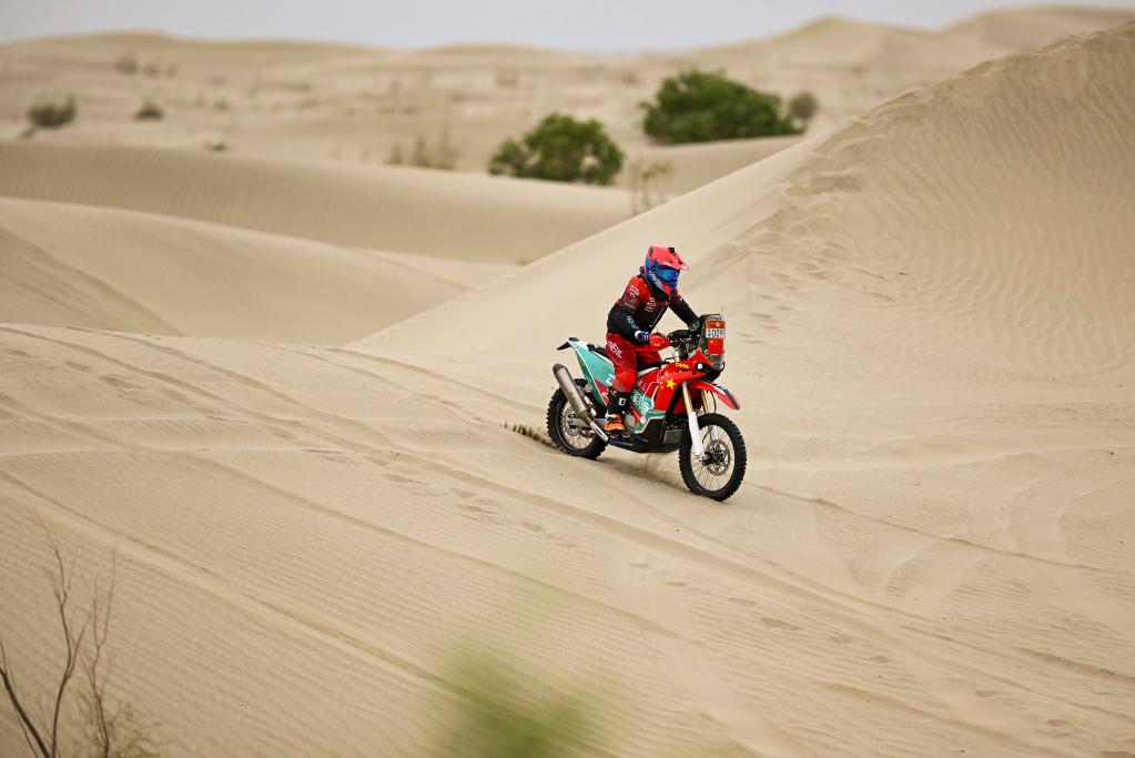 5月26日,重庆凯越越野车队车手张雪骑行在塔克拉玛干沙漠中