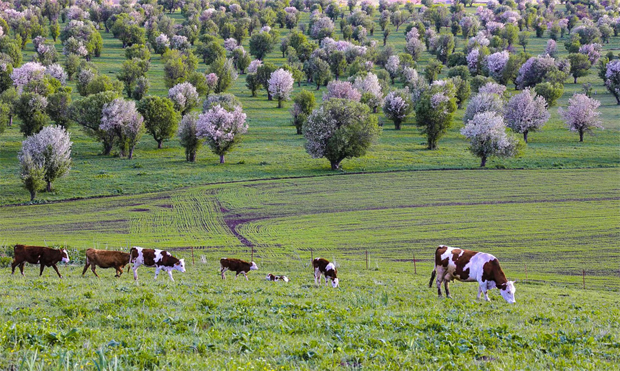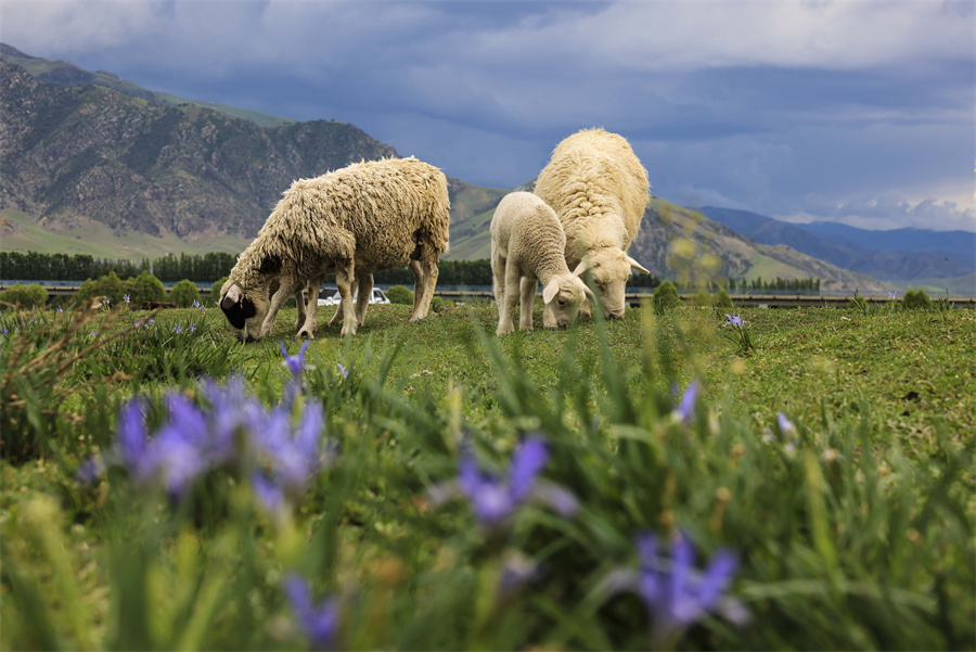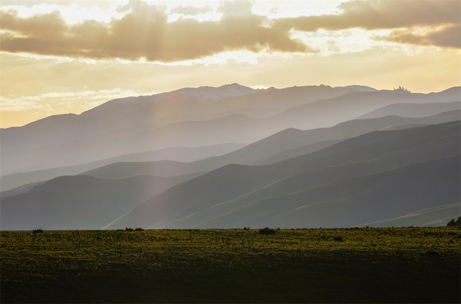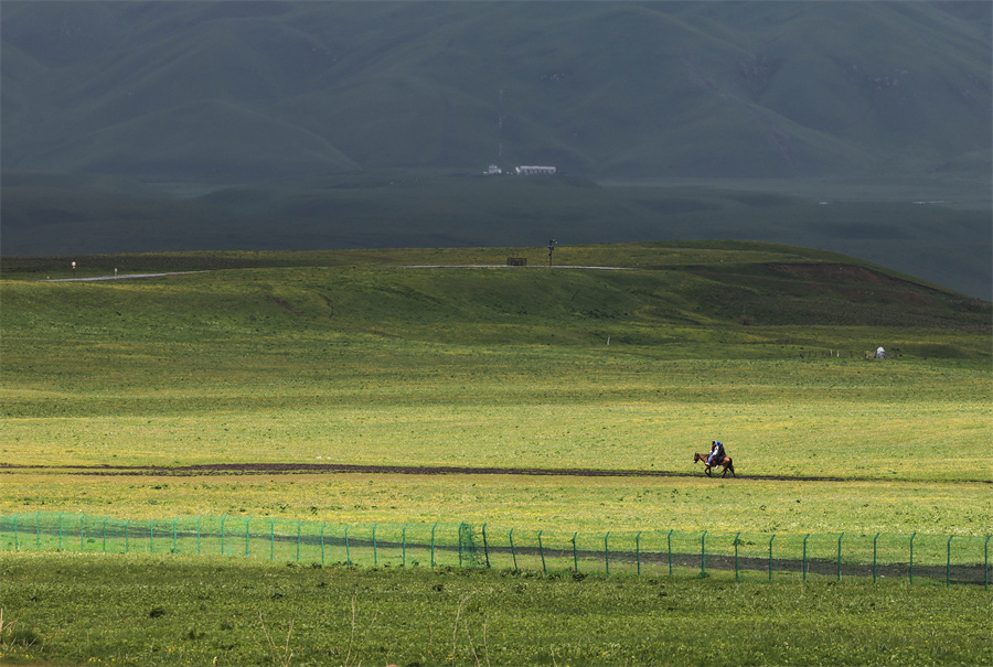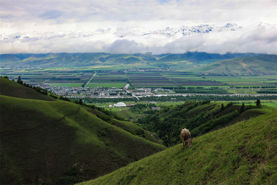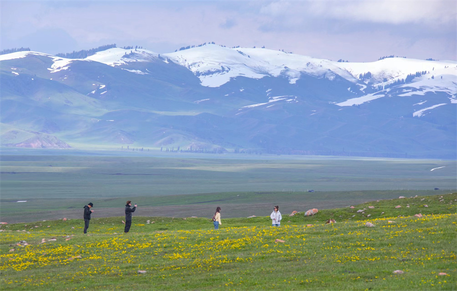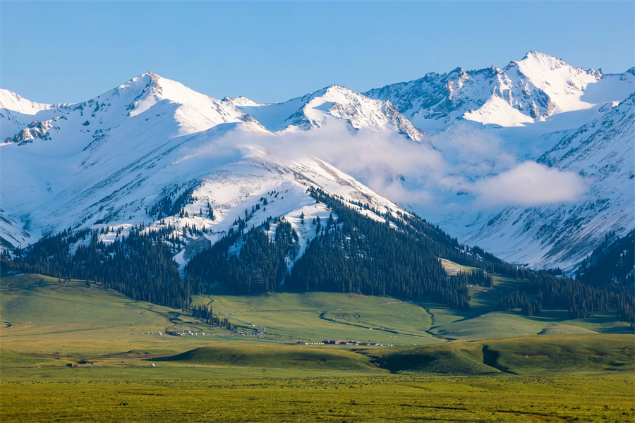 远处的雪山与山脚下的绿草相互映衬。张文庭 摄