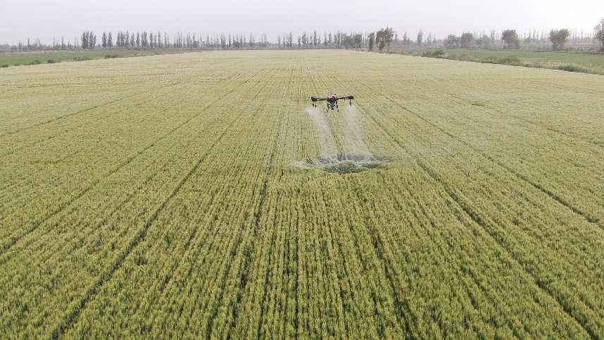 目前,第一师阿拉尔市的14余万亩小麦进入灌浆期。在二团新井子镇七连的麦田,放眼望去,千亩麦田一展平,万亩麦田一颜色,一架架植保无人机来回穿梭,为小麦精准施肥喷药,科技赋能提升农业生产效率,为夏粮丰收增产打下坚实基础。