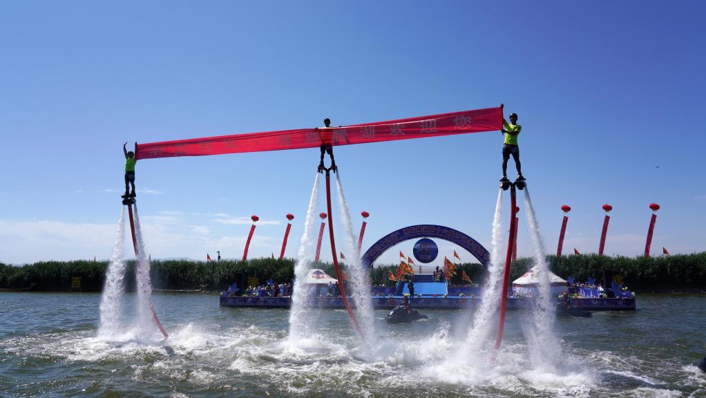 新疆博斯腾湖第十六届开湖季捕鱼节“水上飞人”表演(6月23日摄)。 新华社记者 张啸诚 摄