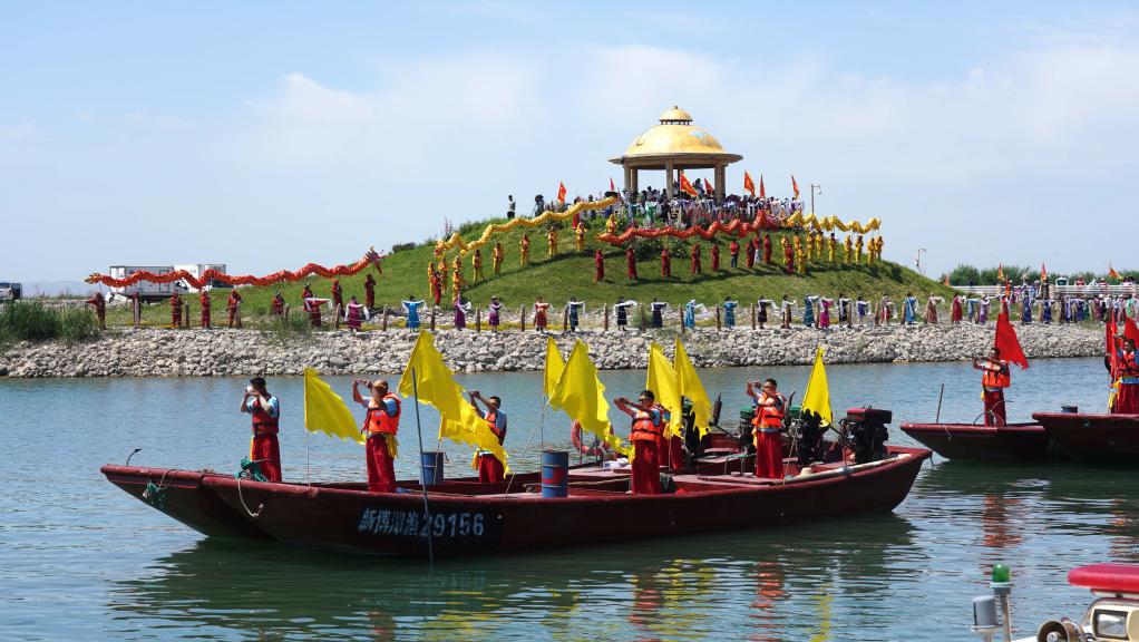 6月23日,新疆博斯腾湖第十六届开湖季捕鱼节上,渔民进行祭湖醒网仪式。新华社记者 张啸诚 摄