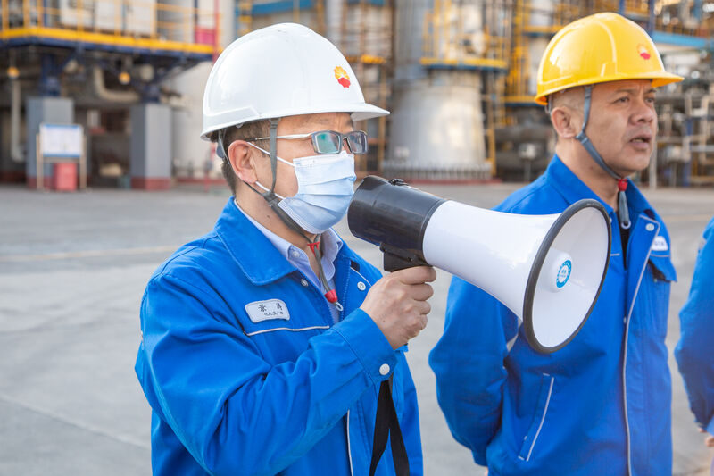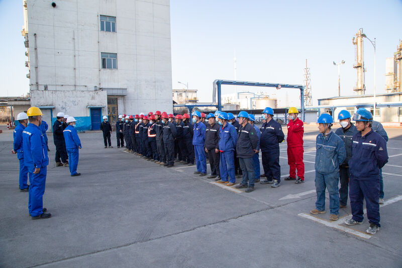 乌鲁木齐石化公司化肥生产部员工在检修作业前开展安全喊话。廖聪敏 摄