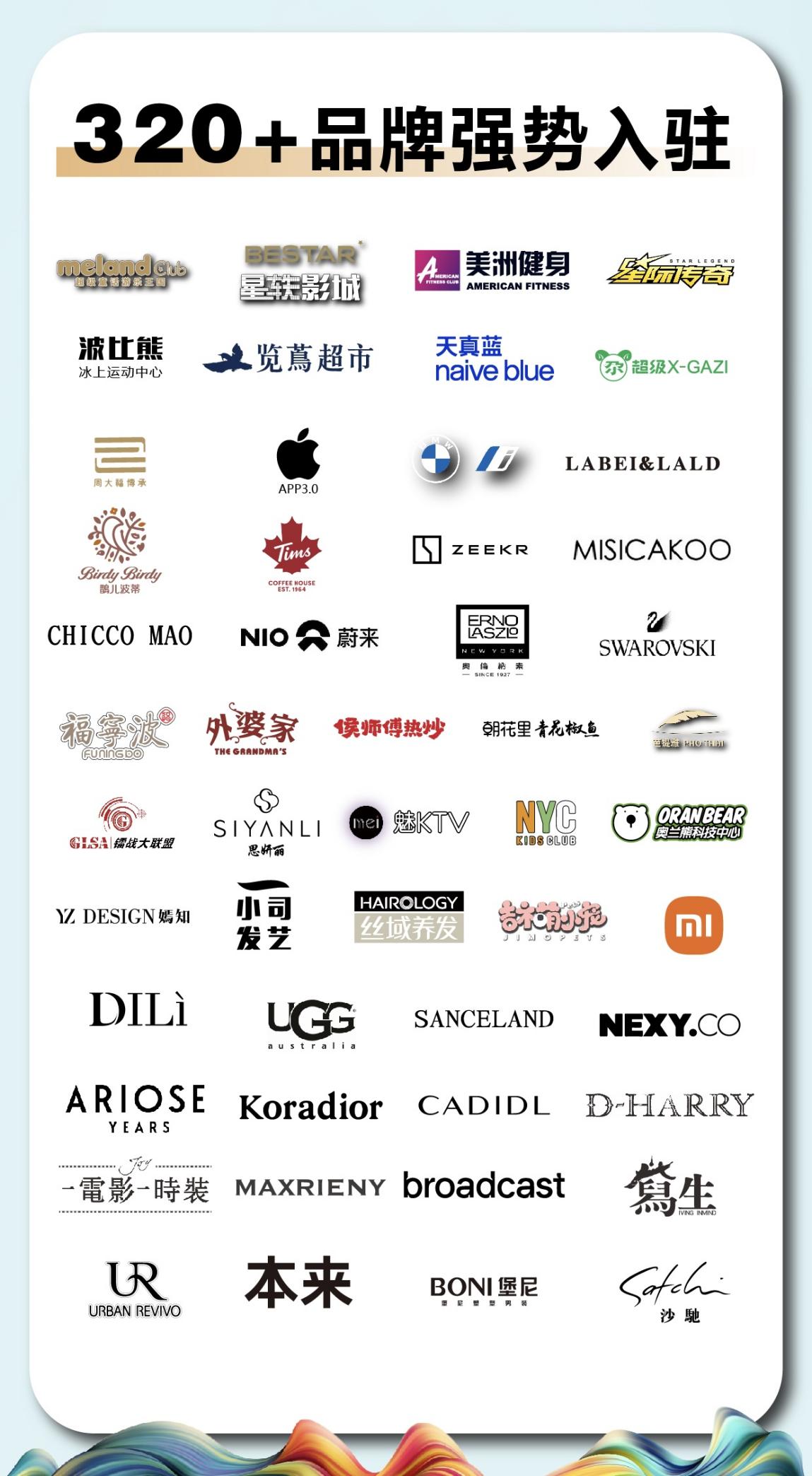 业态组合上,围绕“国际一线妆品及国际精品”、“餐饮黑珍珠品牌”、“新兴能源品牌”、“沉浸式娱乐体验品牌”,引进超2000㎡的男士精品生活馆大地绅士荟、24小时全息光影秀场餐厅超级·小尕子、北美咖啡品牌Tims金枫叶旗舰店、潮流运动健身品牌美洲健身、宝马新能源汽车体验店BMW ispace、7D全息投影星轶影城、高品质儿童成长空间品牌meland club等,构建了强大的创新品牌矩阵,缔造新奢商业的全新范本。