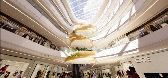 项目内部空间拥有「时尚疆潮」主中庭,「前卫绿洲」和「潮流沙海」次中庭,通过国际化视野与在地化打造,寻找文化共鸣,还原城市消费者的美好生活想象。未来将契合艺术美学,在购物中心内演绎商业活动和策展,以“艺术+”营造多元空间场景,展示城市与艺术相交融的艺术客厅。