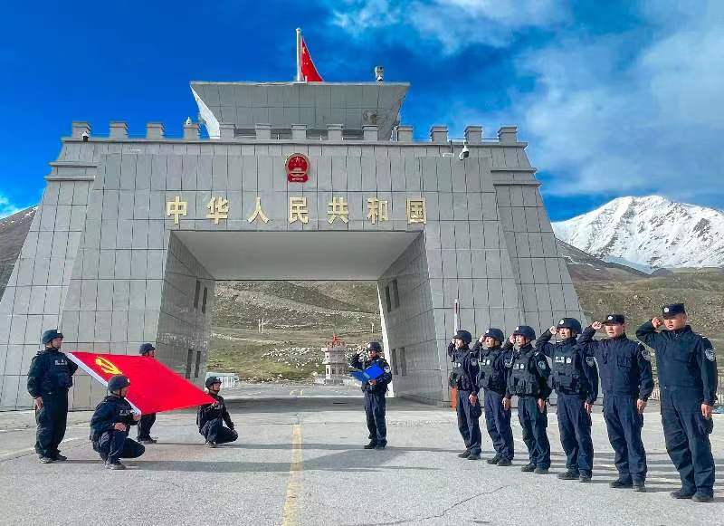 “我志愿加入中国共产党,拥护党的纲领,遵守党的章程,履行党员义务……”,7月1日,在海拔5100米的红其拉甫山口,新疆红其拉甫出入境边防检查站全国特级优秀人民警察张雷作为带班队长,带领前哨班民警重温入党誓词,全体民警精神抖擞、警容严谨,铮铮誓言响彻高原边关。