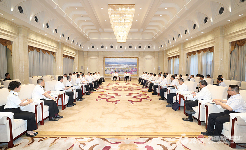 7月11日,自治区党委书记马兴瑞、自治区主席艾尔肯·吐尼亚孜在乌鲁木齐会见海关总署署长、党委书记俞建华一行。石榴云/新疆日报记者 崔志坚摄