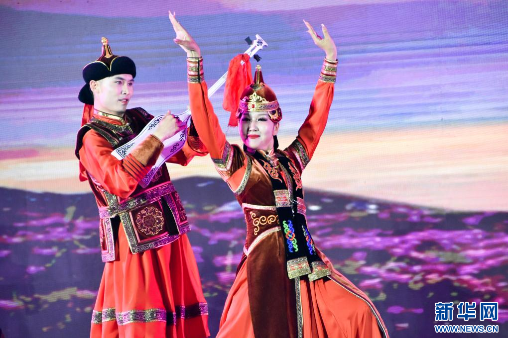 7月13日,新疆博尔塔拉蒙古自治州歌舞团演员在表演《江格尔》。新华社记者 张瑜 摄