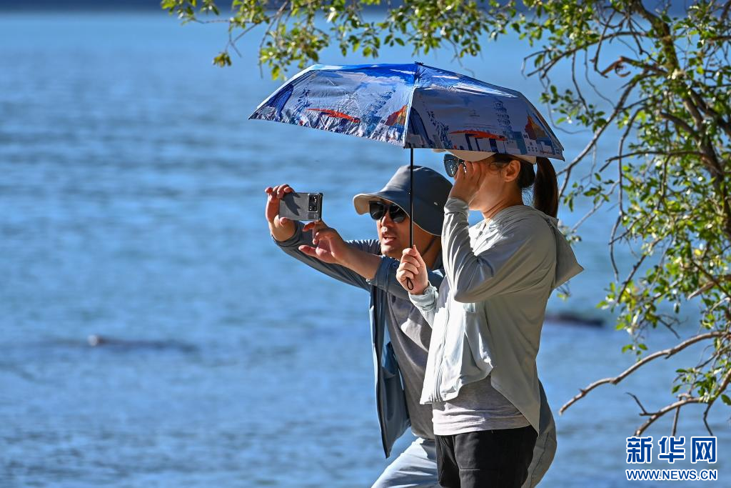 游客在新疆阿勒泰地区喀纳斯景区内的卧龙湾打卡拍照(7月19日摄)。新华社记者 丁磊 摄pagebreak