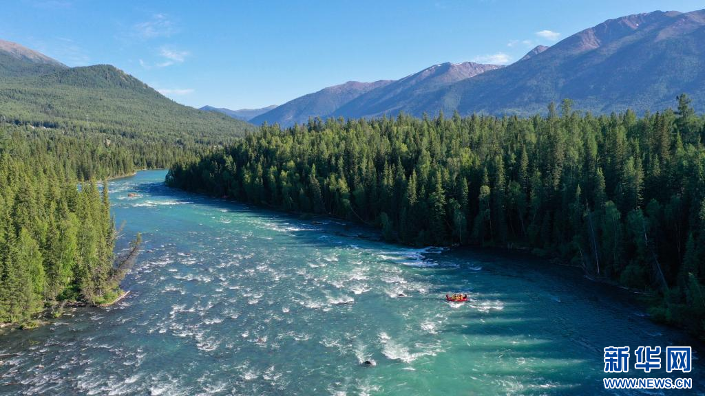 游客在新疆阿勒泰地区喀纳斯景区体验漂流项目(7月19日摄,无人机照片)。