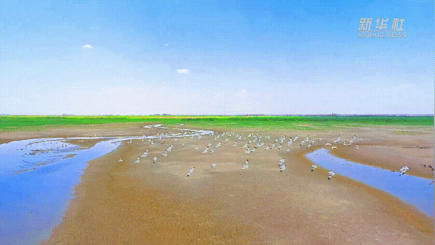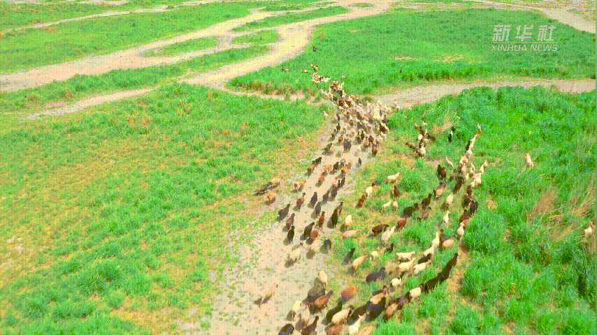 蓝天白云下,绿草青青,牛羊成群;碧水清波旁,群鸟高声鸣叫,展翅翱翔,构成了一幅美丽的生态画卷。