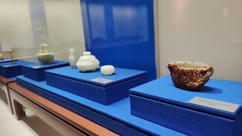 新疆维吾尔自治区博物馆“故宫厅”首展展出的玉器藏品。新华社记者周晔摄