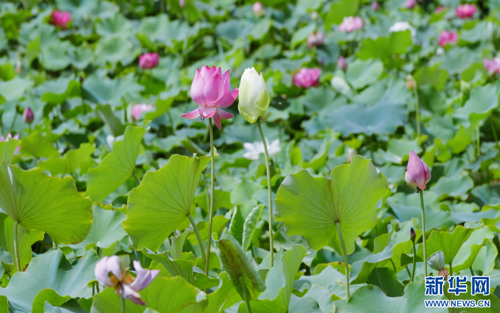 盛夏时节,在新疆库车市墩阔坦镇荷花村,荷塘的荷花竞相开放,千姿百态。