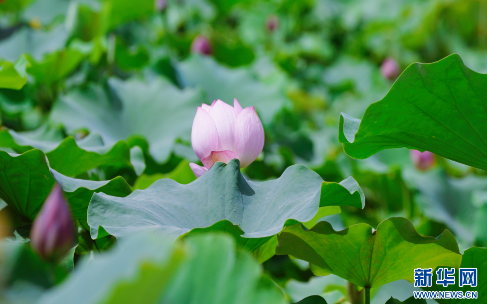 大片荷花在水中静谧绽放,把水面点缀得愈发清新,吸引游客前来打卡拍照。