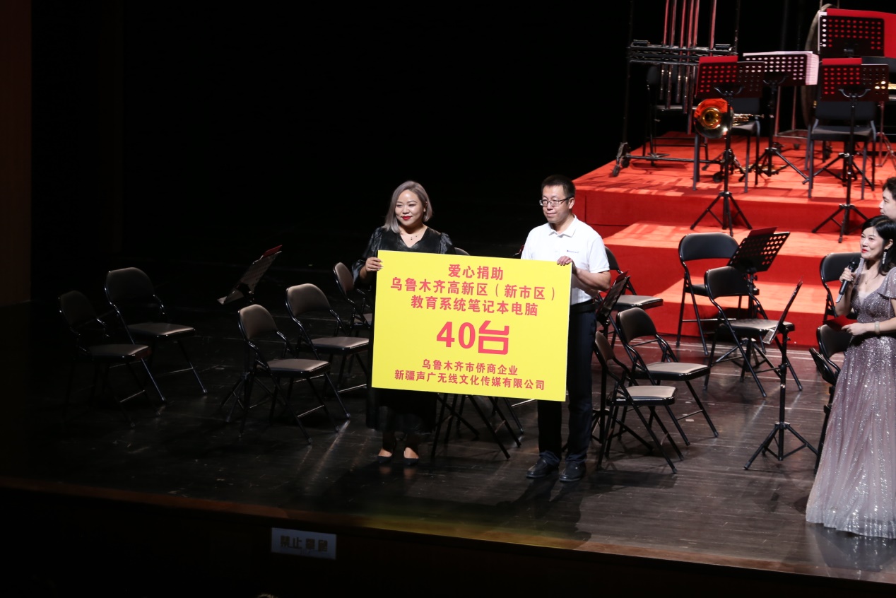 8月12日,金山爱乐乐团“新疆之夜”交响音乐会现场,乌鲁木齐市侨联委员、自治区青年联合会优秀代表、新疆声广无线文化传媒有限公司为高新区(新市区)教育系统捐赠笔记本电脑40台。