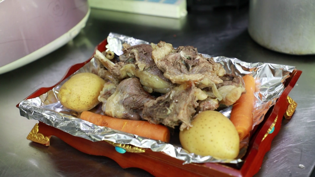 在等待美食的间隙,巴·阿拉回忆说,年幼时跟着家人放牧,路途遥远食物不易保存,他们就会将新鲜的羊肉连骨剁成小块,包进一张完整的羊肚子里,撒上一点盐,就地取些湖水滋润,用树枝条封住羊肚的口儿,再用一根空心的芦苇秆插在封口处,用以通气,以防羊肚受热膨胀后爆开。最后把羊肚包肉全部放进烤热的石头里,就可以坐等美食了。“参加工作以后,我想再复刻一下童年的味道,尝试后,家人都说很成功,于是我在原来的基础食材上进行创新,经过不断尝试,最终确定添加土豆、黄萝卜、红薯的口味最好,大家都非常喜欢。”巴·阿拉说。