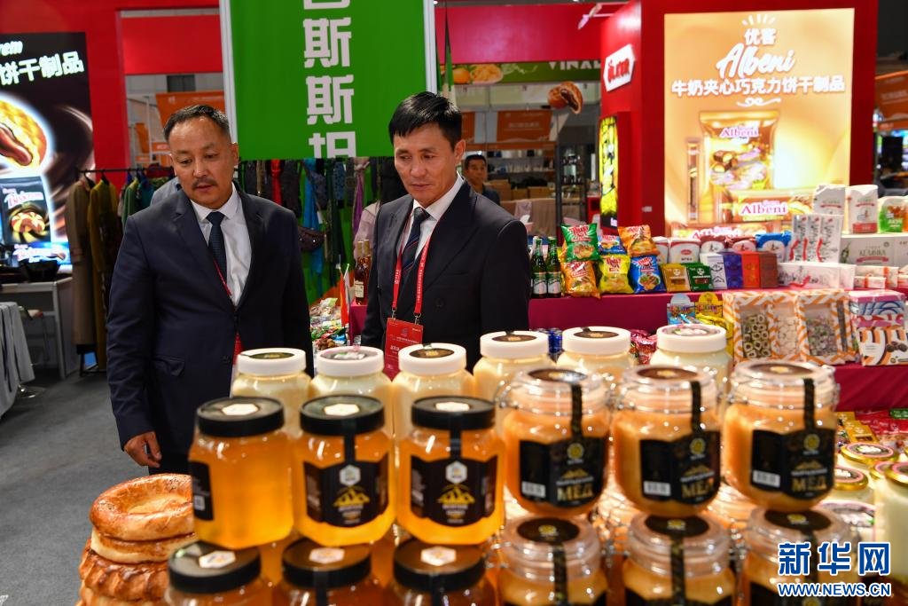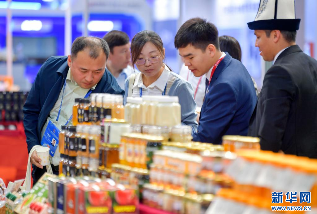 8月17日,来自吉尔吉斯斯坦的客商在2023(中国)亚欧商品贸易博览会上查看本国产的蜂蜜。新华社记者 赵戈 摄pagebreak