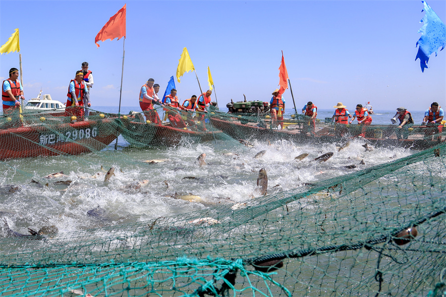 为确保博斯腾湖渔业资源可持续发展,每年3月1日至6月20日为禁渔期。禁渔期结束后,当地都会举行盛大的开湖仪式,举办“头鱼”拍卖会。各地游客和养殖户齐聚湖边,欢庆丰收,享用美食。