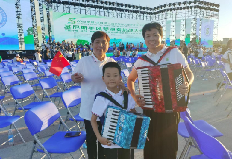 黄曼英(右一)带着7岁的孙子在基尼斯手风琴演奏挑战塔城主会场合影留念。