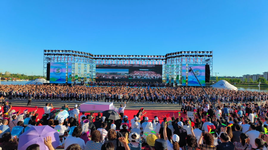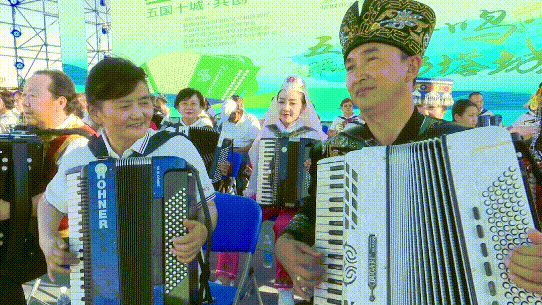 新疆塔城第三届手风琴文化艺术节活动现场,各族群众伴着琴声迎接远方的客人。