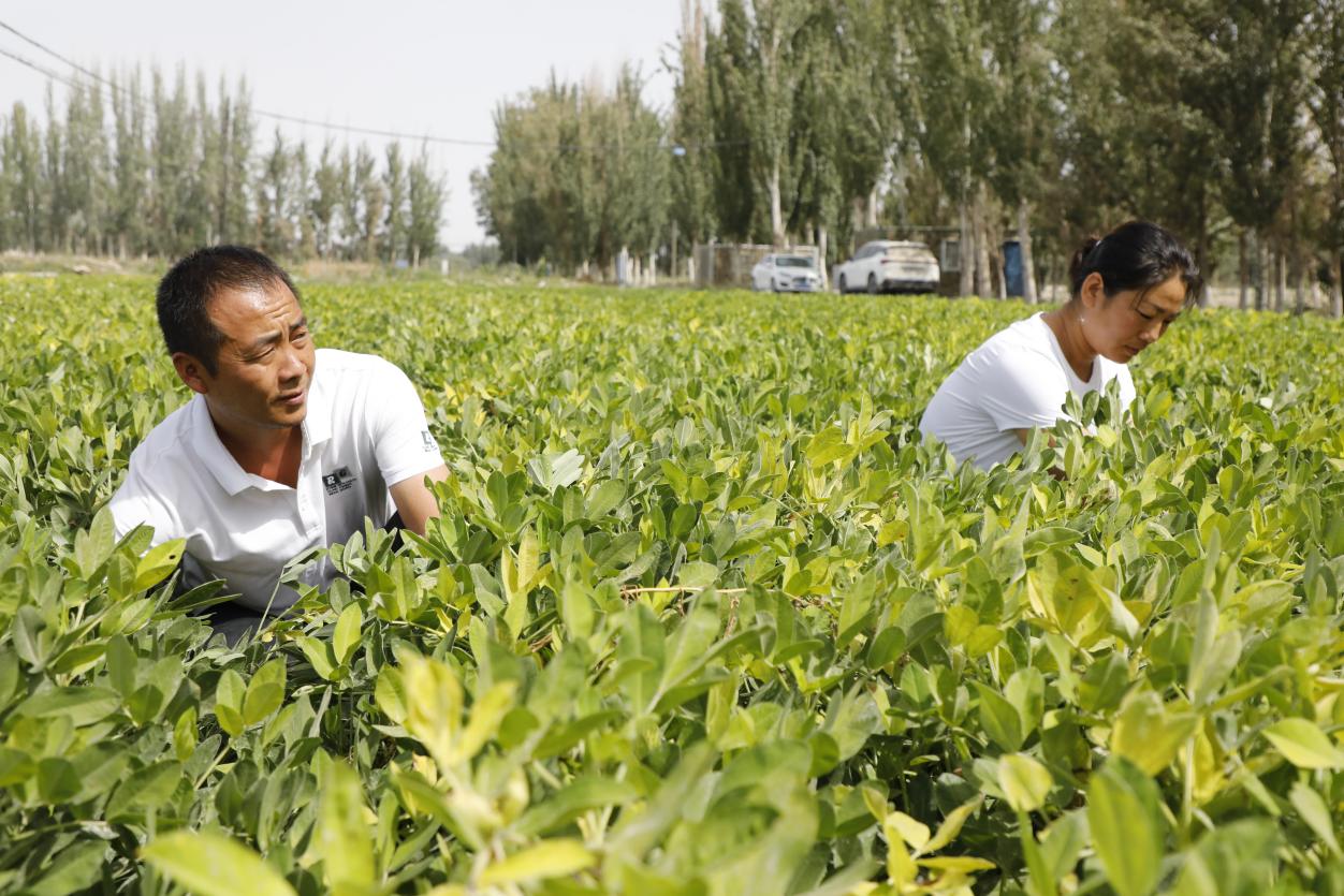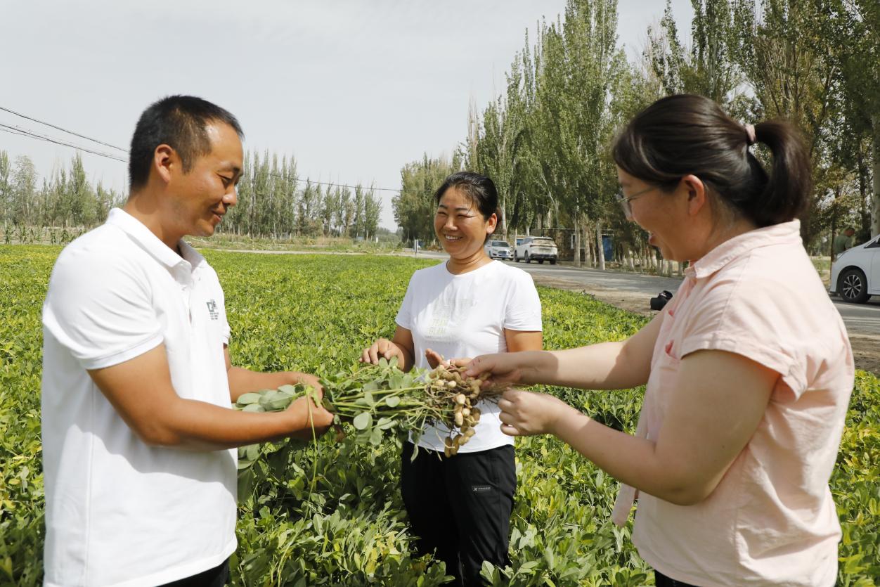 十团昌安镇农发中心专业技术人员王慧娜(右一)实地了解花生长势和花生补贴资金发放情况。乔建林 摄