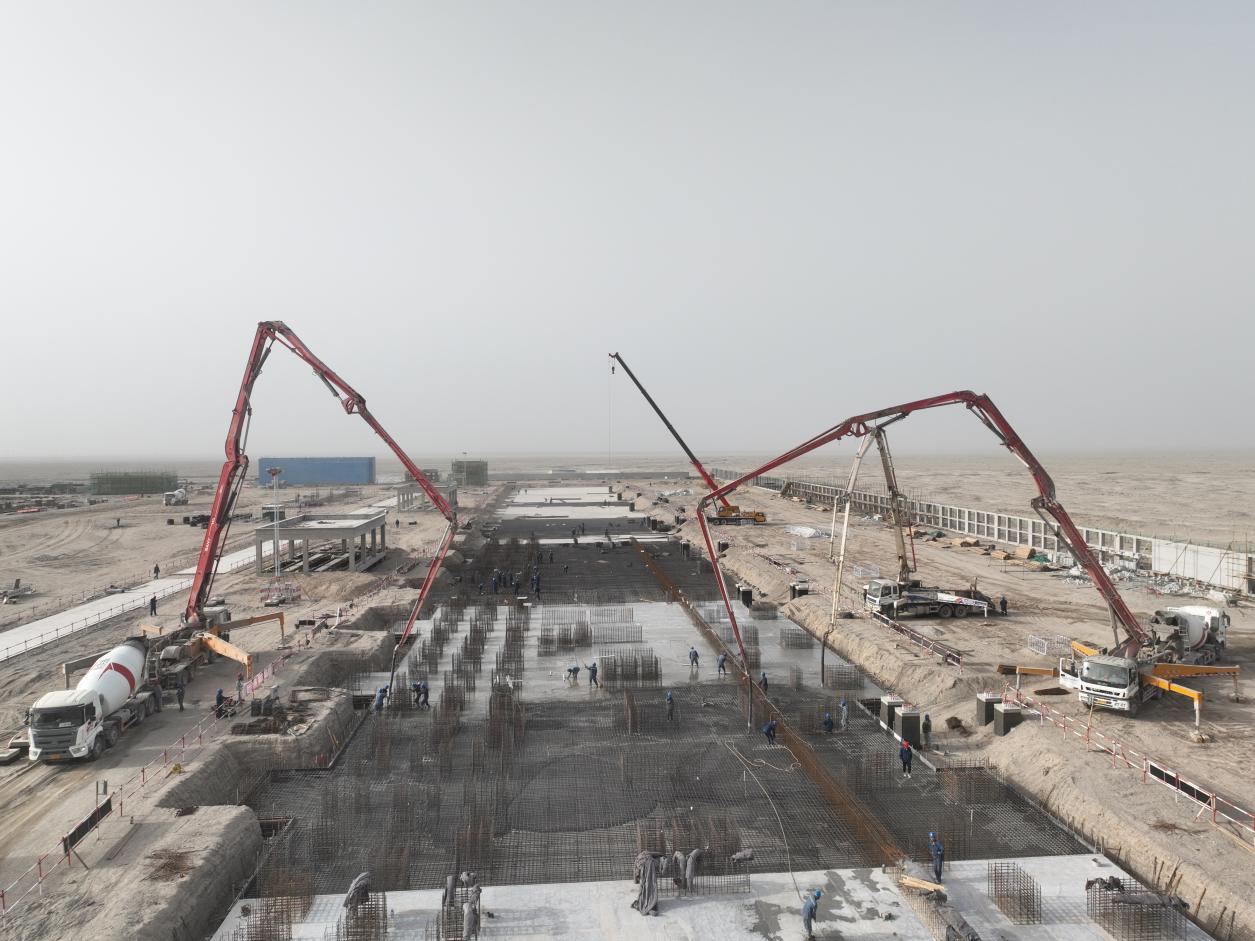 三台大型泵车同时浇筑,仅用6小时就完成1566方量混凝土建筑,这也是若羌750变电站开工以来最大一次方量的浇筑工作,高效完成750千伏GIS设备的基础浇筑,为后期变电站设备安装奠定坚实基础。