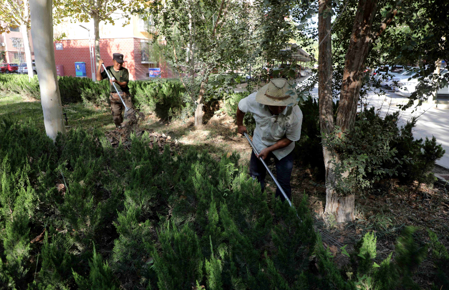 工作人员清扫小区绿化带。林国强摄