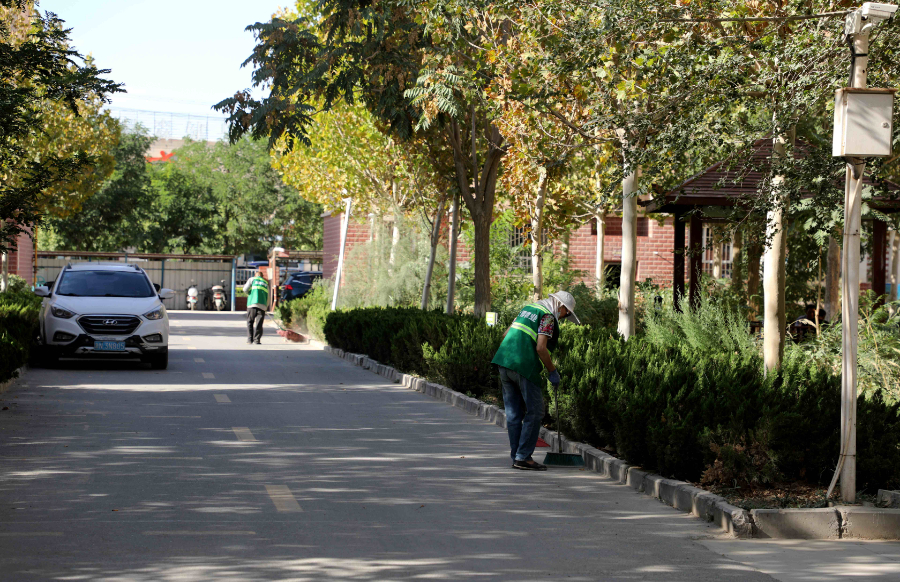 御景佳苑小区保洁人员清扫路面。林国强摄