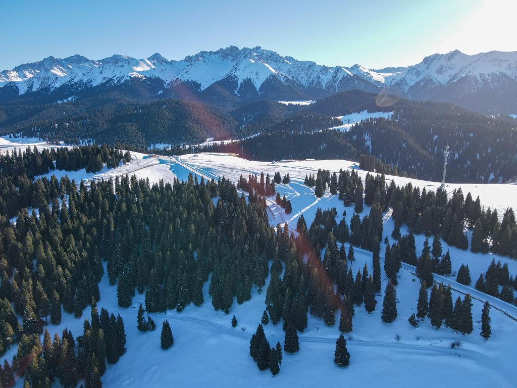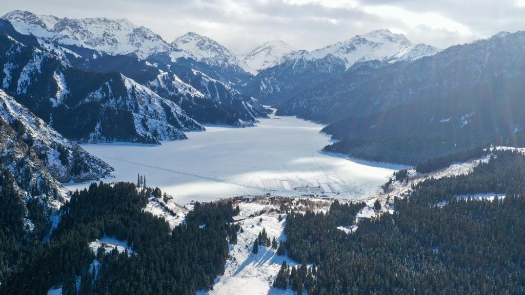新疆阜康市境内天山天池景区(2023年1月25日摄,无人机照片)。新华社发(郭刚 摄)