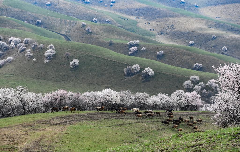 新疆伊犁杏花烂漫,当地牧民驱赶牛群经过那拉提杏花谷的一片草地(2020年4月4日摄)。新华社记者 宋彦桦 摄