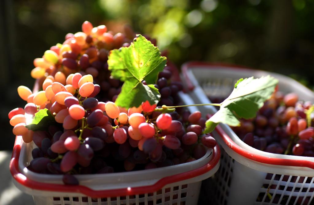 新疆吐鲁番市高昌区农户家中刚刚采摘下来的葡萄(2017年8月24日摄)。新华社记者 王菲 摄