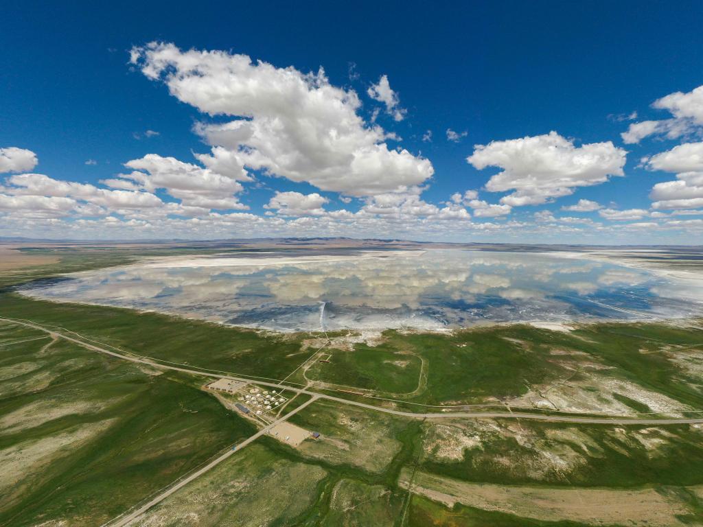 新疆哈密市巴里坤湖风光(2021年7月1日摄,无人机照片)。新华社记者 胡虎虎 摄