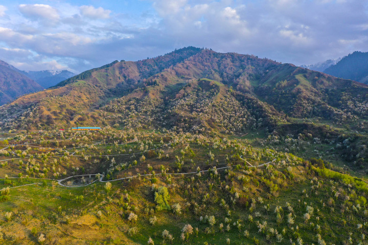 中国科学院新疆生态与地理研究所伊犁植物园春景(2022年4月21日摄,无人机照片)。新华社发(张文庭 摄)
